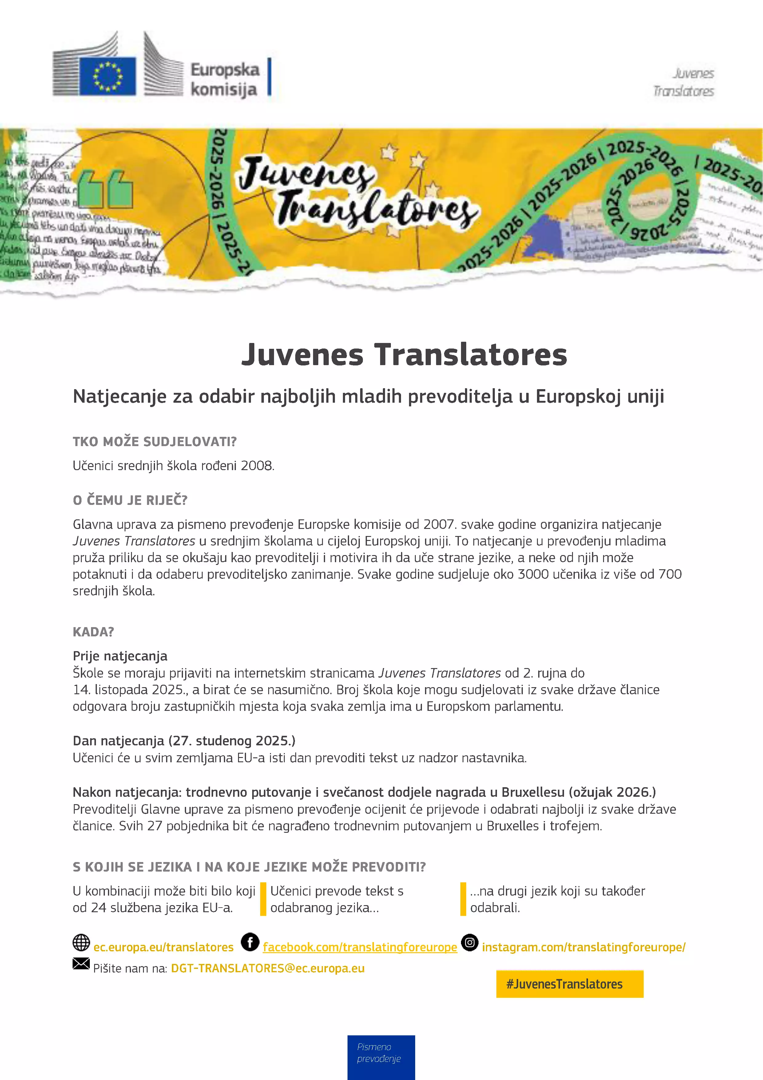 JUVENES TRANSLATORES - NATJECANJE ZA ODABIR NAJBOLJIH MLADIH PREVODITELJA U EU